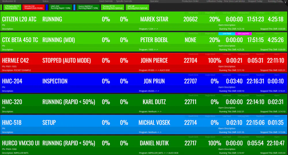 • Live Machine Monitoring – Displays the status of every machine (running, idle, setup, etc.) in real time