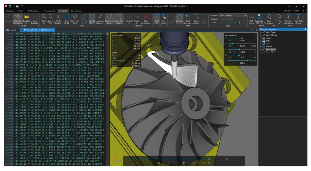 • 3D Machine Environment – Visualizes the tool, fixtures, stock material, and the full kinematics of the machine, detecting errors before they occur